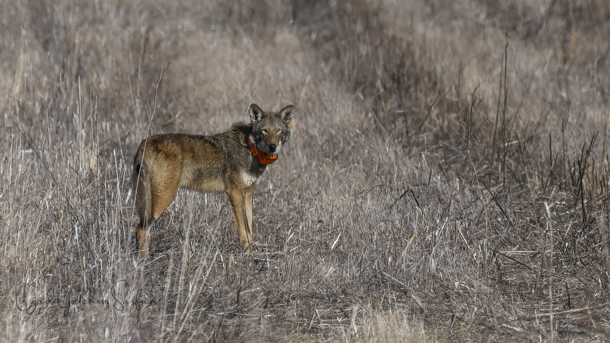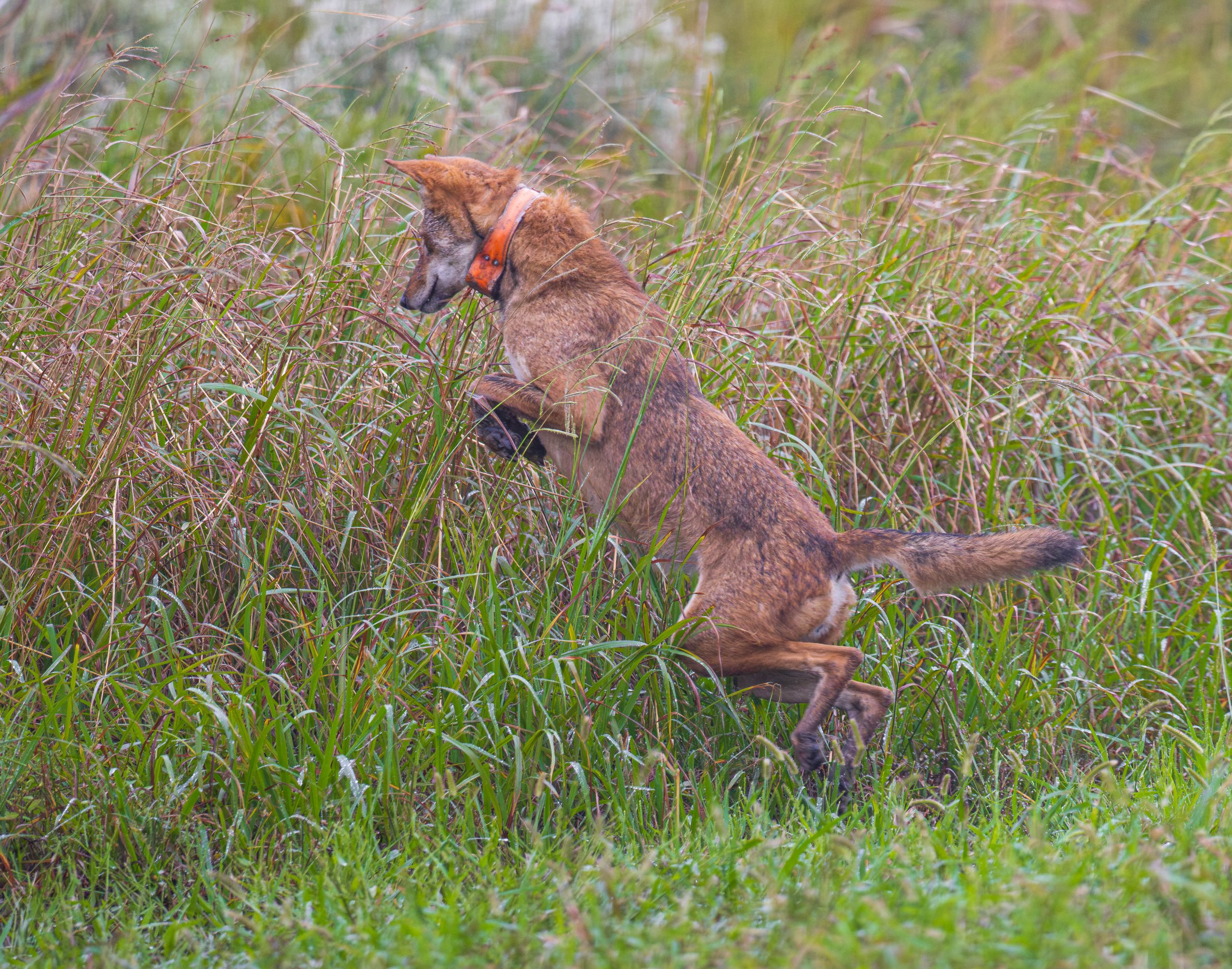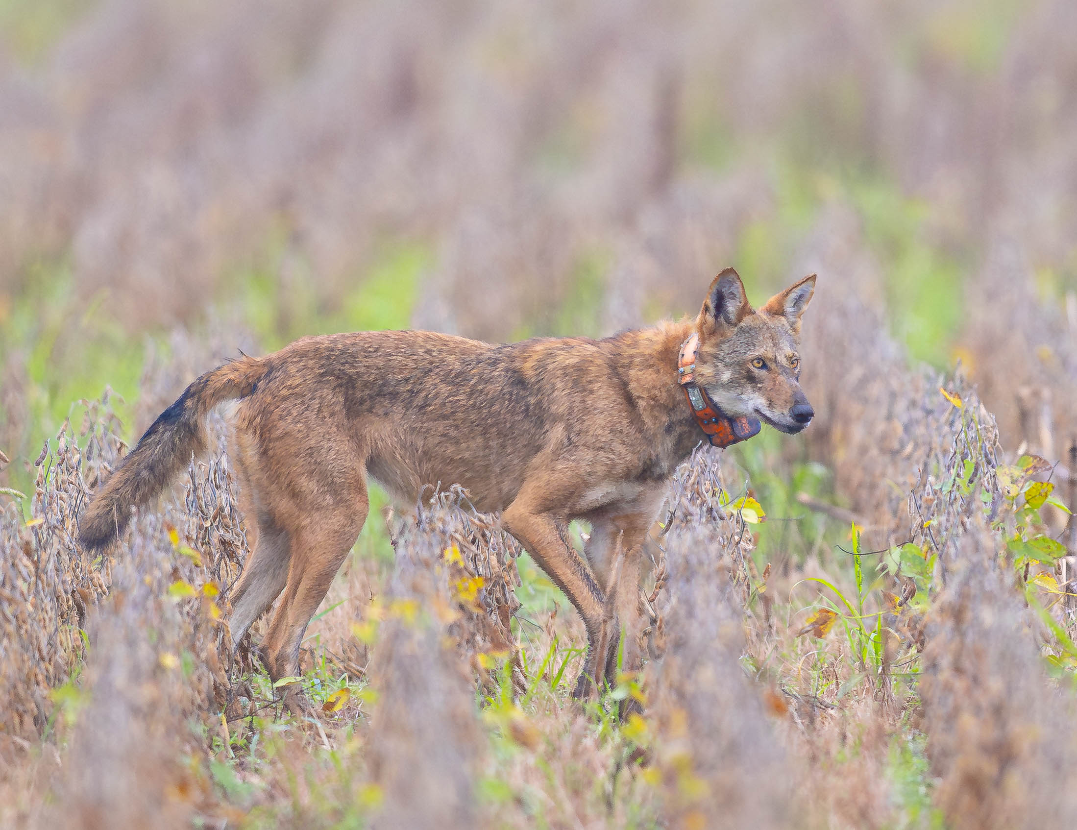 Elusive Red Wolf 2225F — Red Wolf 2225F has not been fitted with a new GPS collar in several years; she is extremely elusive, although she is very active on the landscape. Many who photograph wild Red Wolves know Red Wolf 2225F is the stuff of legends. In 2022, she produced the first wild litter of Red Wolf puppies since 2018, and she has gone on to whelp several more litters. Since several of her offspring have produced their own puppies, Red Wolf 2225F is considered a founder of the many packs we see today. More recently, Red Wolf 2225F has since “retired” as the breeding female for the Milltail Pack; her daughter has taken that title. Red Wolf 2225F has often been monitored via trail cameras taking her grand-puppies out to hunt and explore in their new territory.